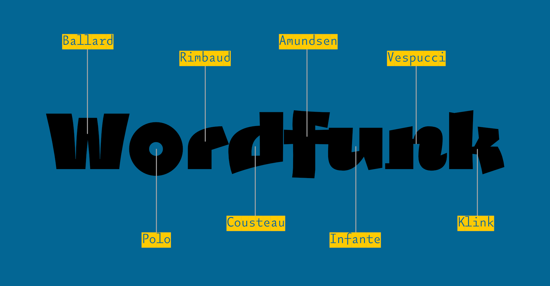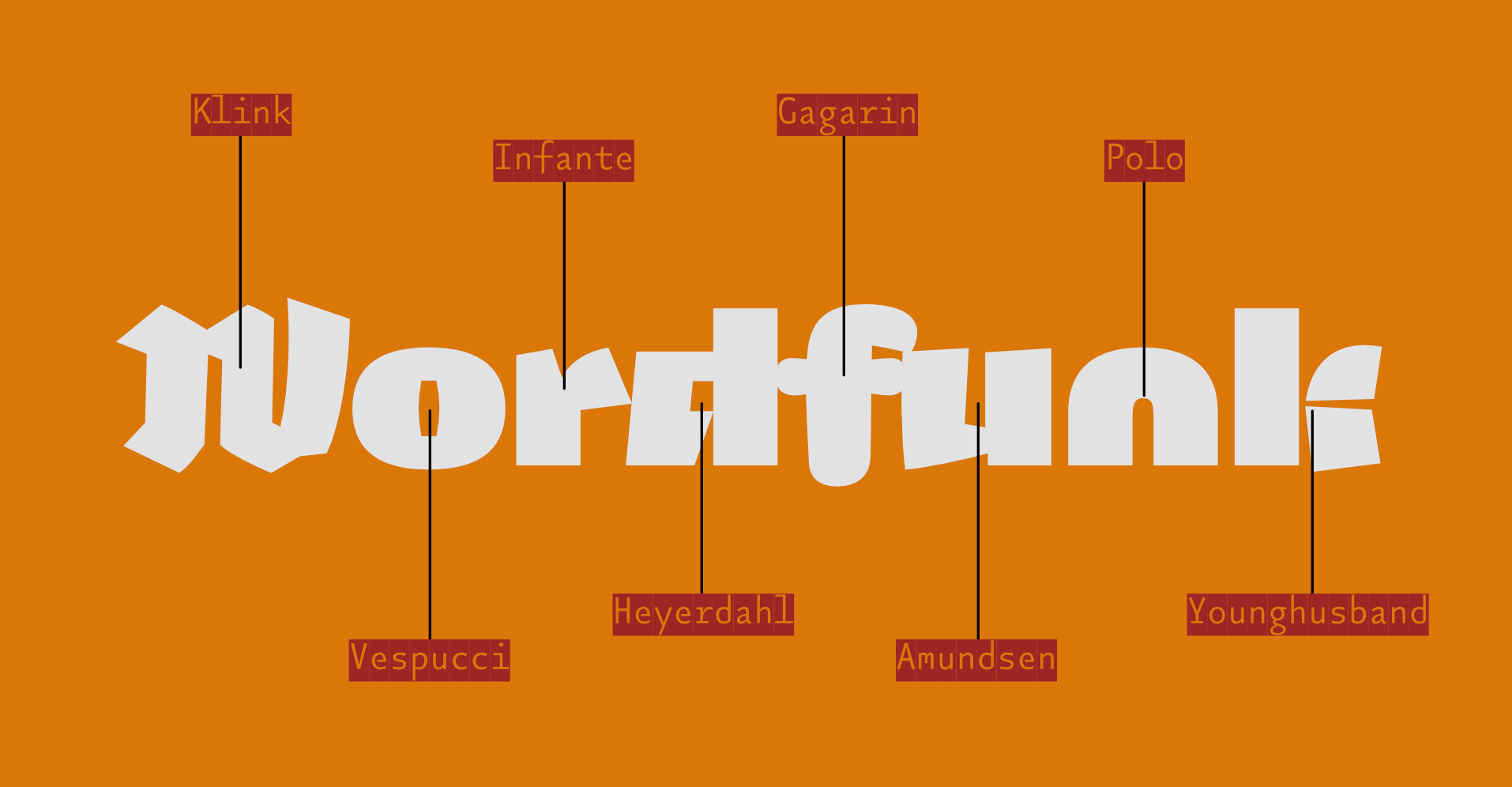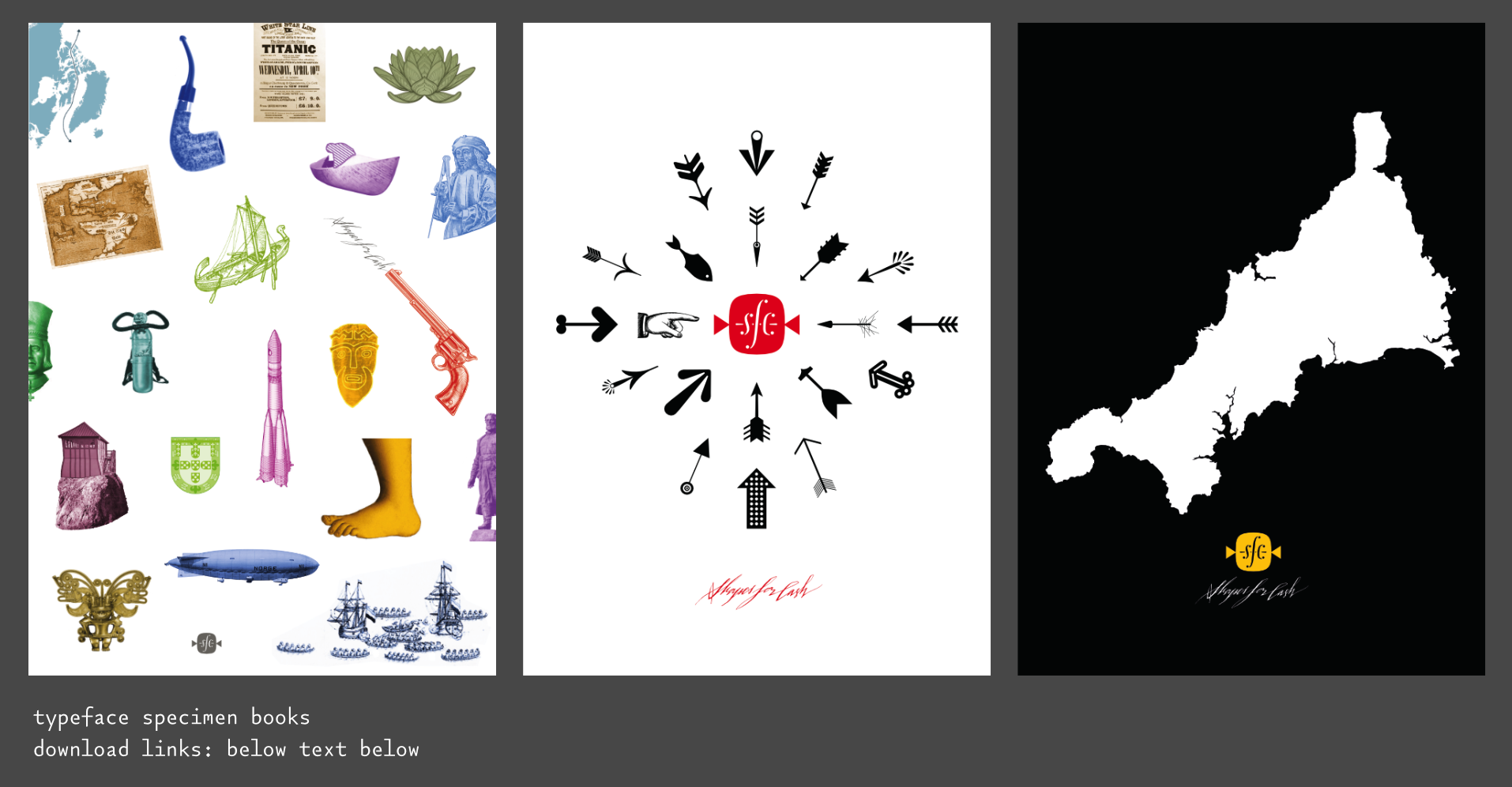 Sometime in the 20th century, I sent a design to the Morisawa Typeface Competition. It won a prize. I called the typeface Vespucci (I suppose I had been reading something about the origin of America at the time.) You will be able to see the original design – as presented in Morisawa’s brochure – by scrolling the gallery above ¶ At a later date, I found myself drawing more fat grotesques, and as I had named a similar design after an explorer, I carried on (sometimes naming a typeface is harder than designing it) ¶ There was no initial plan to make these designs belong together, I was just enjoying the drawing. The collection of sketches eventually grew to the point where a stapler was required, and so it seemed like a good idea to try and impose some order on them. Many of their base characteristics were brought into some kind of alignment with each other, and they were forced to share an x-height and other vertical metrics (extenders [ascenders & descenders]) ¶ The years passed, and I continued messing about. I thought it would be nice for each character in the now 20+ designs to share the same widths, so that they could be interchanged to make some interesting interactions of shape. An A could be replaced with any of the other 19 A’s without interfering with the length of the word. I quickly abandoned this thought, realising the mind-numbing amount of work it would take ¶ Then a friend (Rutherford Craze) made the same suggestion. Oh Dear! ¶ And so it came to pass that I made all twenty a's the same width; and the g's; the R's; even the pilcrows and the spaces, and so on, and so on ¶ I apologise in advance for the absurdly high stack of type testers below (20, one for each design) but I would like you to play with all the designs to appreciate the subtleties. You will be able to set the same words above and below each other to make comparisons between the designs ¶ It is not possible to completely mix them up here on the site, but as this is one of the purposes of the family, I have put some examples of my own mixing in the gallery above. There are also a series of specimen booklets you can download: Book №1 contains stories about the various explorers that the typefaces are named for. Book №2 contains a more visceral, visual and postery display of the family. Book №3 uses the letters to show the astonishing linguistic richness in Cornish place names: the place where the letters were formed ¶ There are also some nice little viddys (on that Instagram that they have now) that show some of the animation potential, here’s one and here’s another and here’s even another