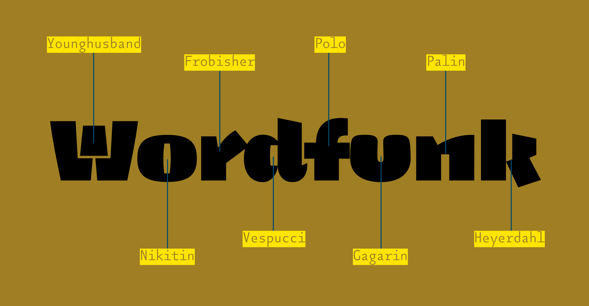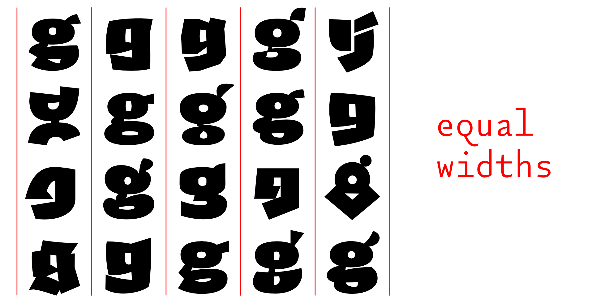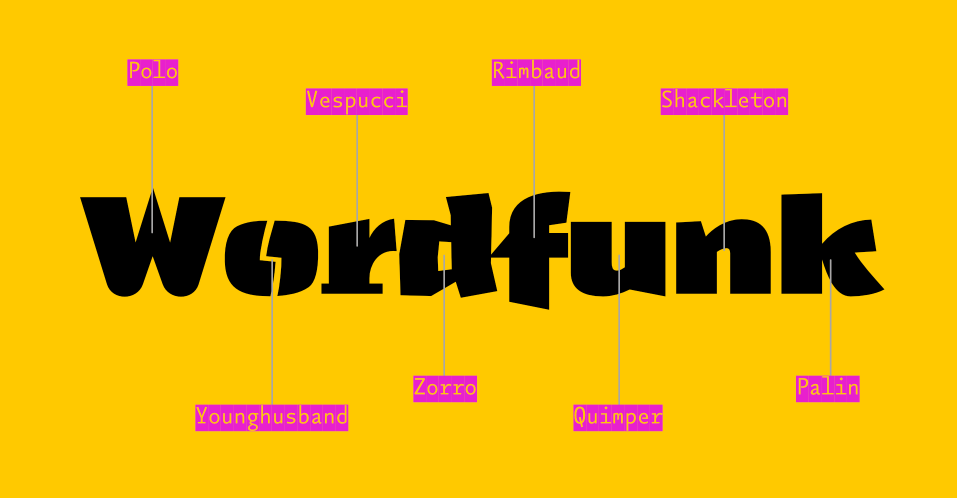 Sometime in the 20th century, I sent a design to the Morisawa Typeface Competition. It won a prize. I called the typeface Vespucci (I suppose I had been reading something about the origin of America at the time.) You will be able to see the original design – as presented in Morisawa’s brochure – by scrolling the gallery above ¶ At a later date, I found myself drawing more fat grotesques, and as I had named a similar design after an explorer, I carried on (sometimes naming a typeface is harder than designing it) ¶ There was no initial plan to make these designs belong together, I was just enjoying the drawing. The collection of sketches eventually grew to the point where a stapler was required, and so it seemed like a good idea to try and impose some order on them. Many of their base characteristics were brought into some kind of alignment with each other, and they were forced to share an x-height and other vertical metrics (extenders [ascenders & descenders]) ¶ The years passed, and I continued messing about. I thought it would be nice for each character in the now 20+ designs to share the same widths, so that they could be interchanged to make some interesting interactions of shape. An A could be replaced with any of the other 19 A’s without interfering with the length of the word. I quickly abandoned this thought, realising the mind-numbing amount of work it would take ¶ Then a friend (Rutherford Craze) made the same suggestion. Oh Dear! ¶ And so it came to pass that I made all twenty a's the same width; and the g's; the R's; even the pilcrows and the spaces, and so on, and so on ¶ I apologise in advance for the absurdly high stack of type testers below (20, one for each design) but I would like you to play with all the designs to appreciate the subtleties. You will be able to set the same words above and below each other to make comparisons between the designs ¶ It is not possible to completely mix them up here on the site, but as this is one of the purposes of the family, I have put some examples of my own mixing in the gallery above. There are also a series of specimen booklets you can download: Book №1 contains stories about the various explorers that the typefaces are named for. Book №2 contains a more visceral, visual and postery display of the family. Book №3 uses the letters to show the astonishing linguistic richness in Cornish place names: the place where the letters were formed ¶ There are also some nice little viddys (on that Instagram that they have now) that show some of the animation potential, here’s one and here’s another and here’s even another