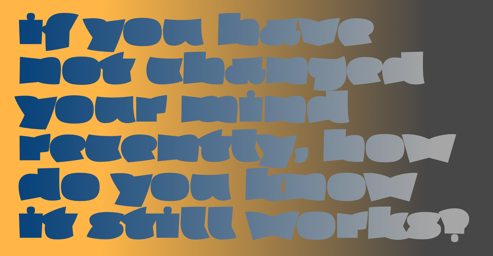 This typeface has me bamboozled to frazzle in attempts to describe it. In trying to fill as much of the available linear space with ink (or pixels [light]), it has become ballooned with squodge (but to avoid the kind of squodge that is evident in Gagarin, or the actual squodge of Squodge,it has been given a few sharp corners). In doing so, it must abandon interior space; so – no counters ¶ some of the shapes incorporate the superellipse, a beautiful shape with a good story attached to it, which I really do recommend you read ¶ I could see it being very satisfyingly cut from metal, but also made into squishy biscuits. I like that the vees – and possibly the EM – look like an opened book; that the kay looks like a churlish crow (or PacMan™ emerging from the bathroom); that the eff looks like that famous criminal penguin with a pompadour in a wind-tunnel; and the asterisk, a lotus blossom ¶ I made a wee viddy that uses it to indulge in a little wordplay.